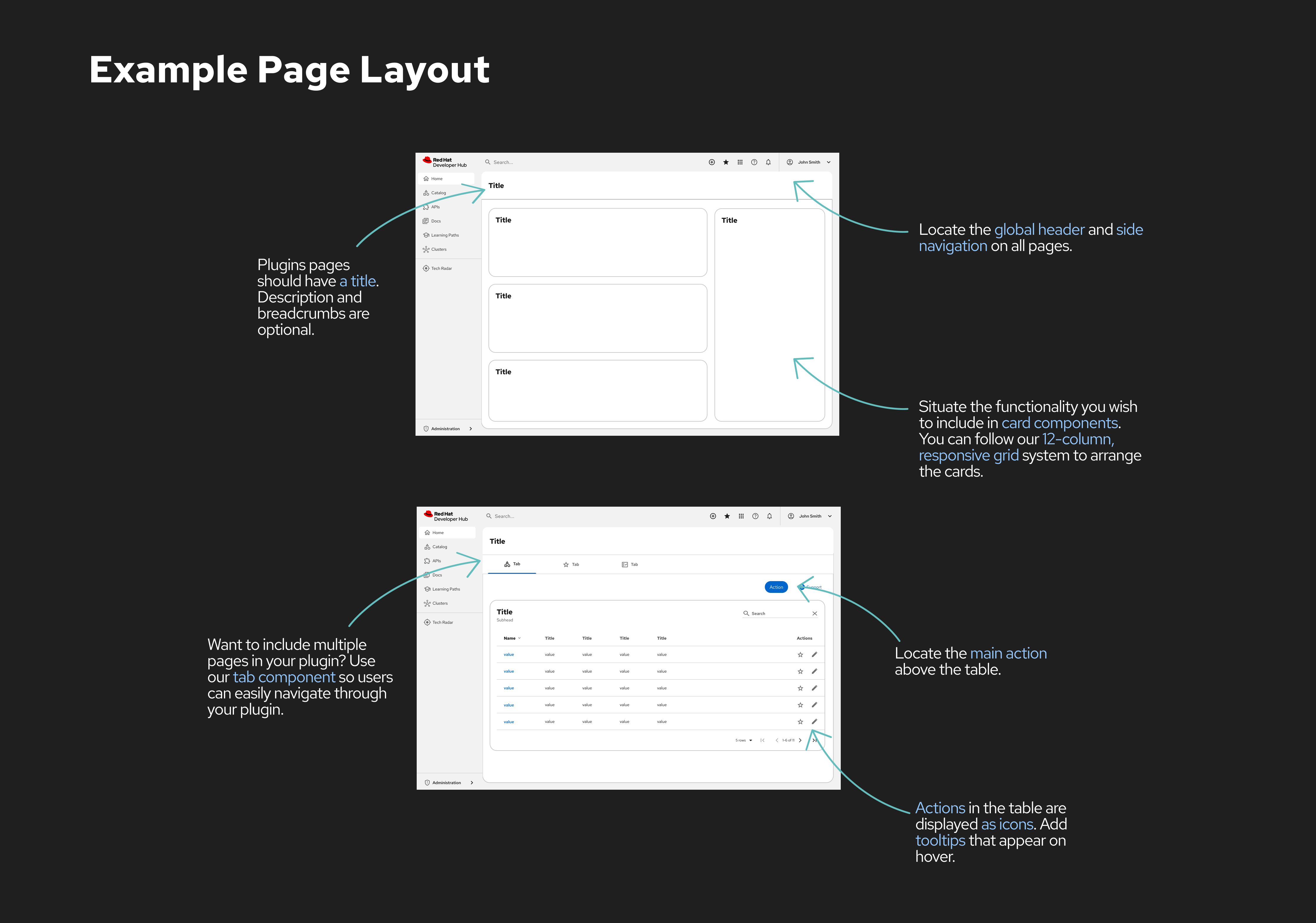 As mentioned earlier, every element you see on RHDH is a plugin, except for the main layout. When designing for RHDH, please consider the following: