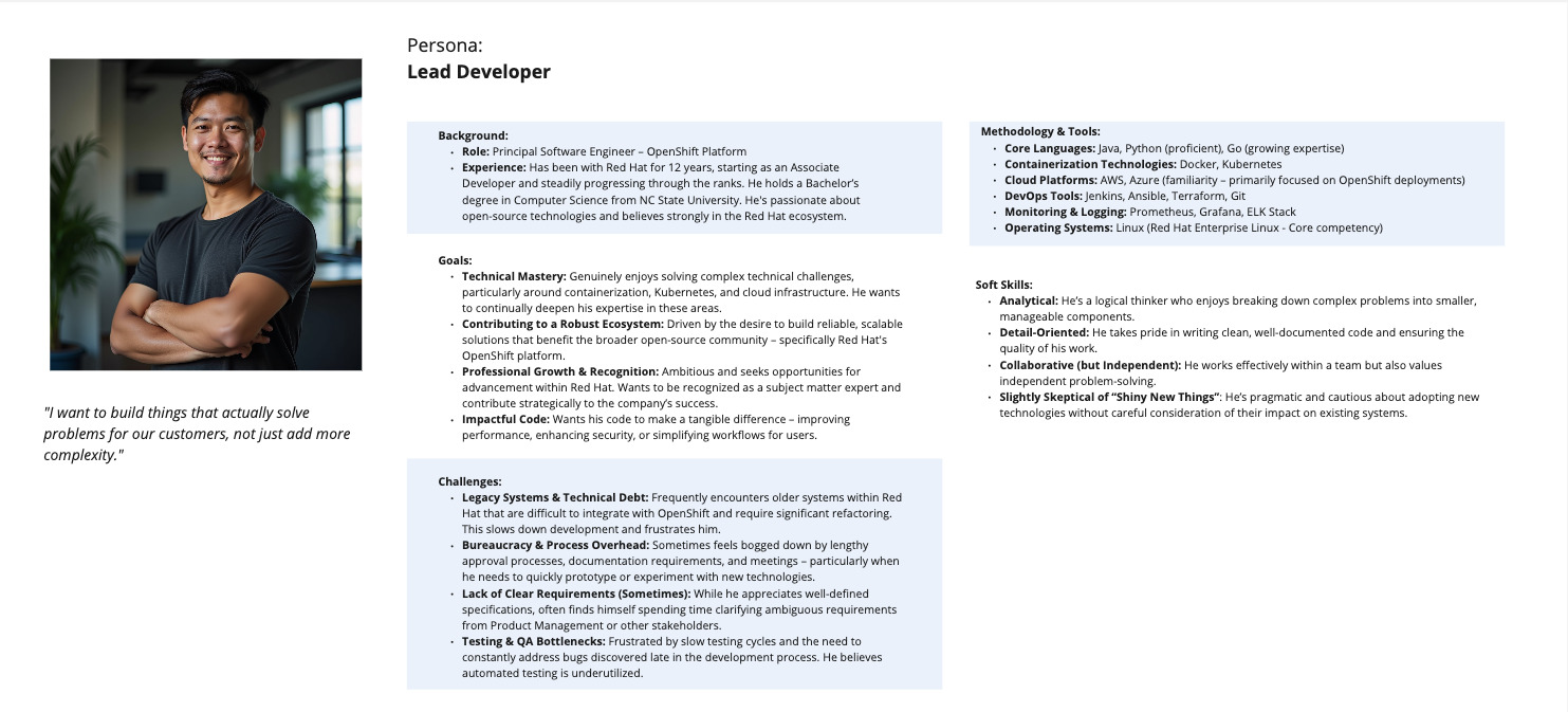 The following persona for a Lead Developer has been used by project teams at Red Hat.